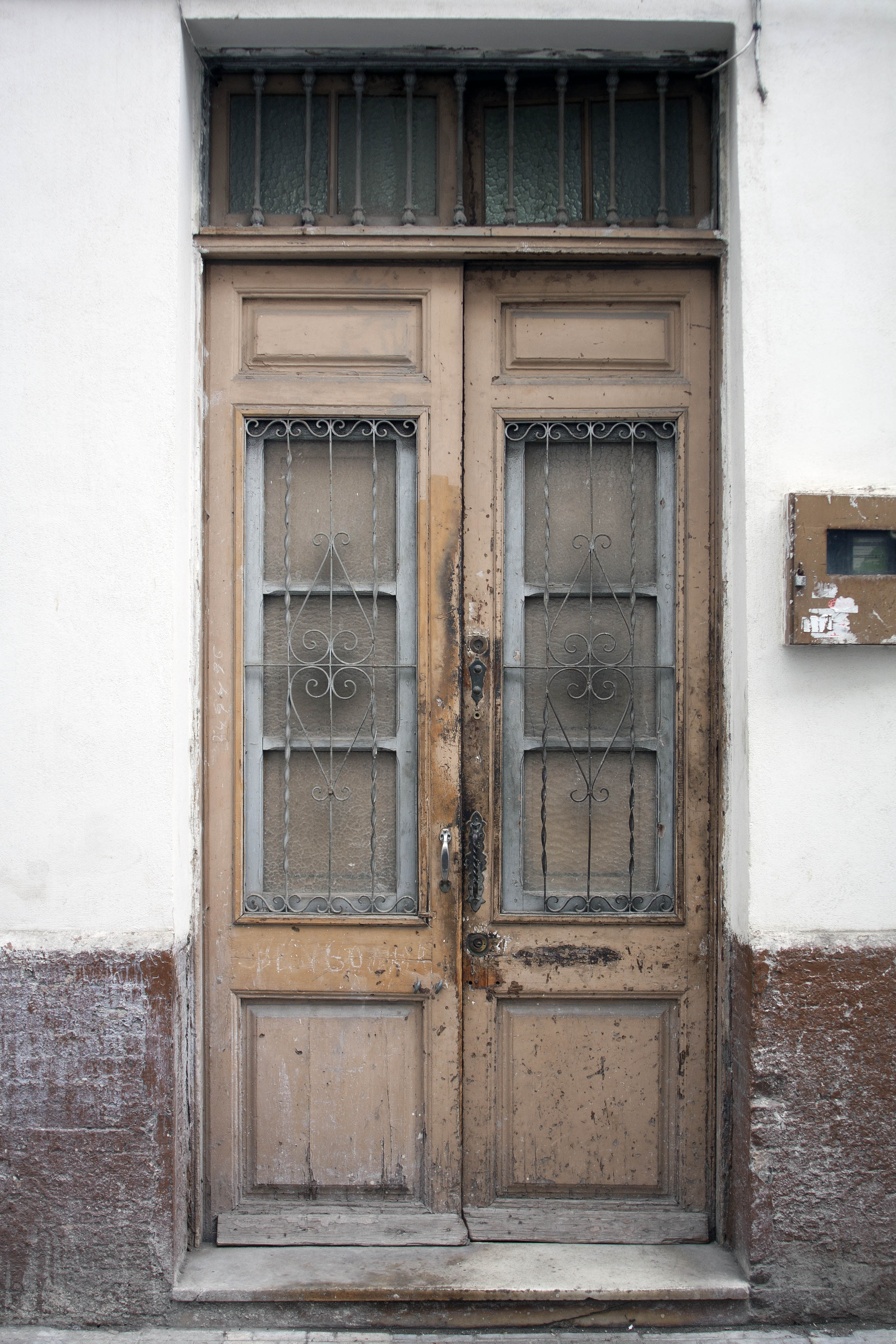 Photo 02639: Worn, yellow, panelled double door with grated top window