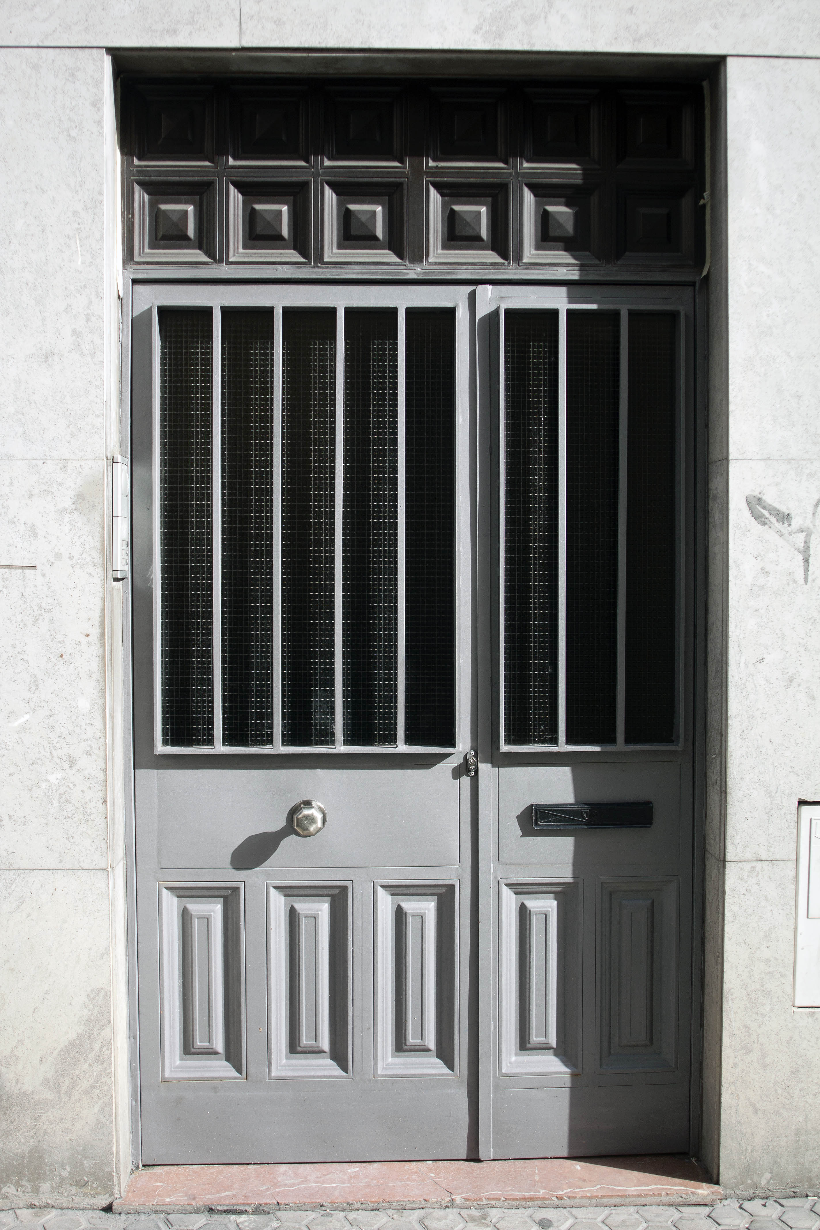 Door knob and letter flap, grey grating in front of the glass, metal panels below and tile panels above. Marble sill, and mounted in wall covered with marble.Photo from Seville, Spain.Size: 2848 x 4272 pixels.
