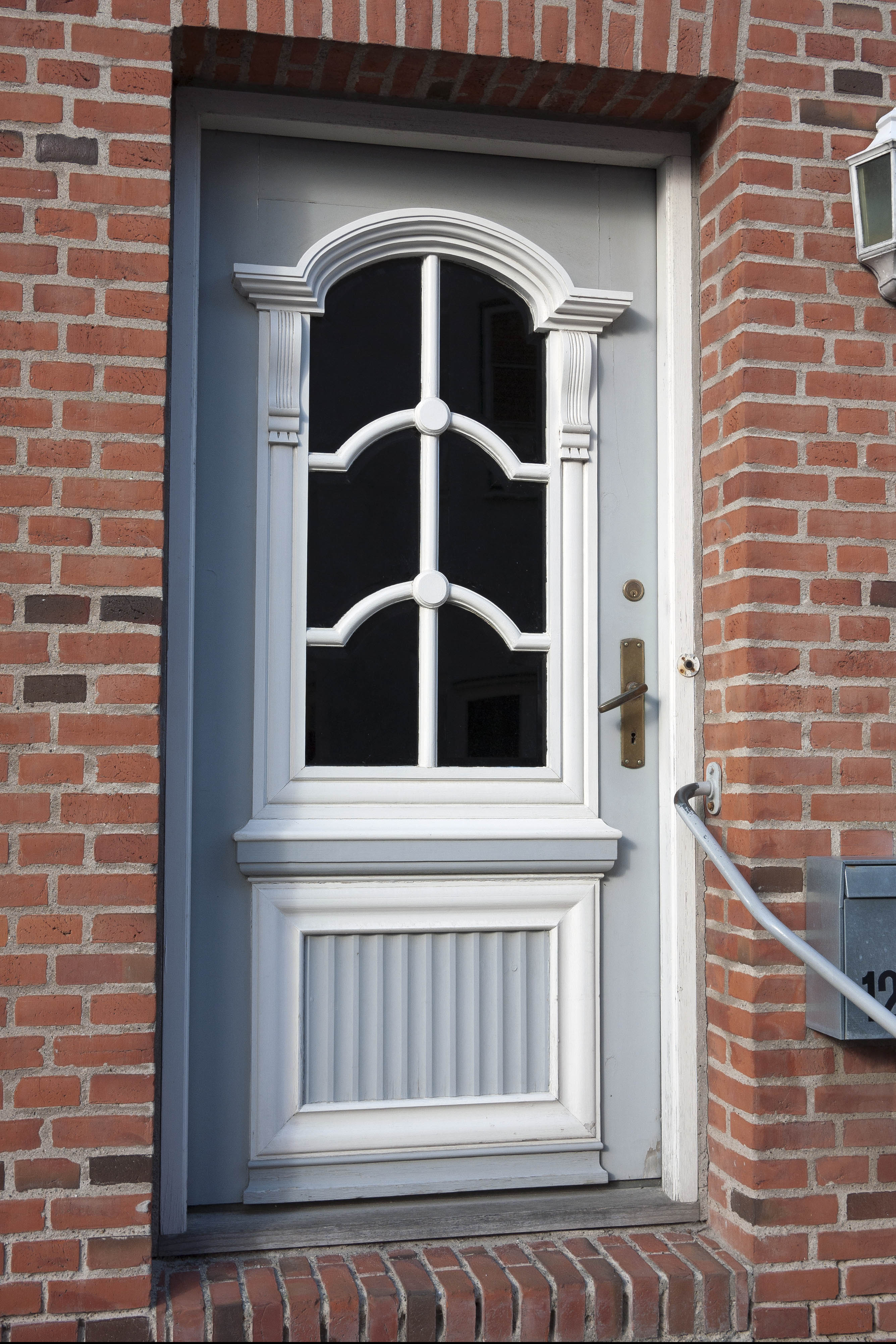 Mounted in a red brick wall. Banisters.Photo from Tønder, Denmark.Size: 2671 x 4006 pixels.