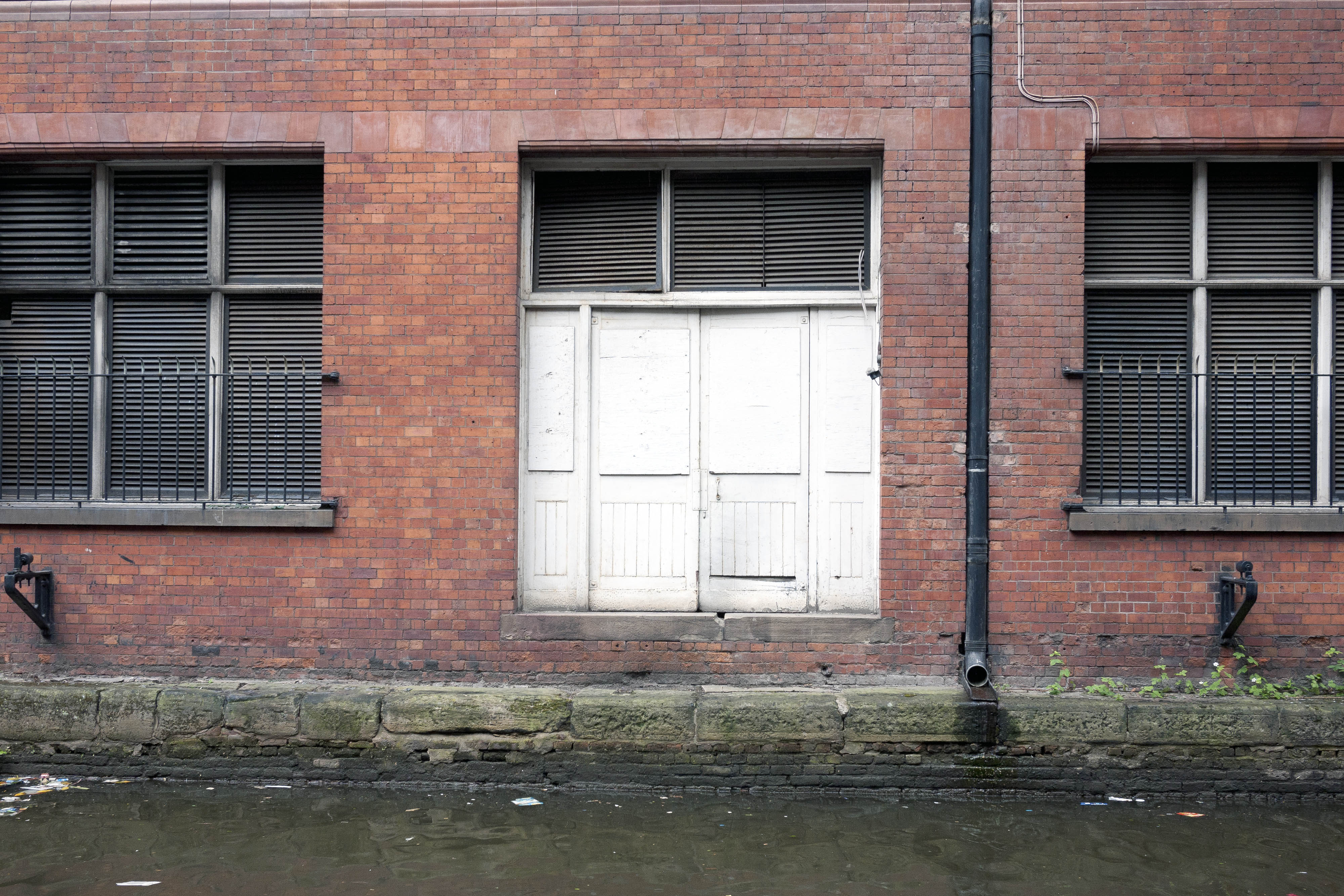 The facade is leading to a canal. Panelled, white double door with sidepieces and top window with ventilation grating. Matching windows, all mounted in a red brick wall.Photo from Manchester, U.K..Size: 4000 x 2667 pixels.
