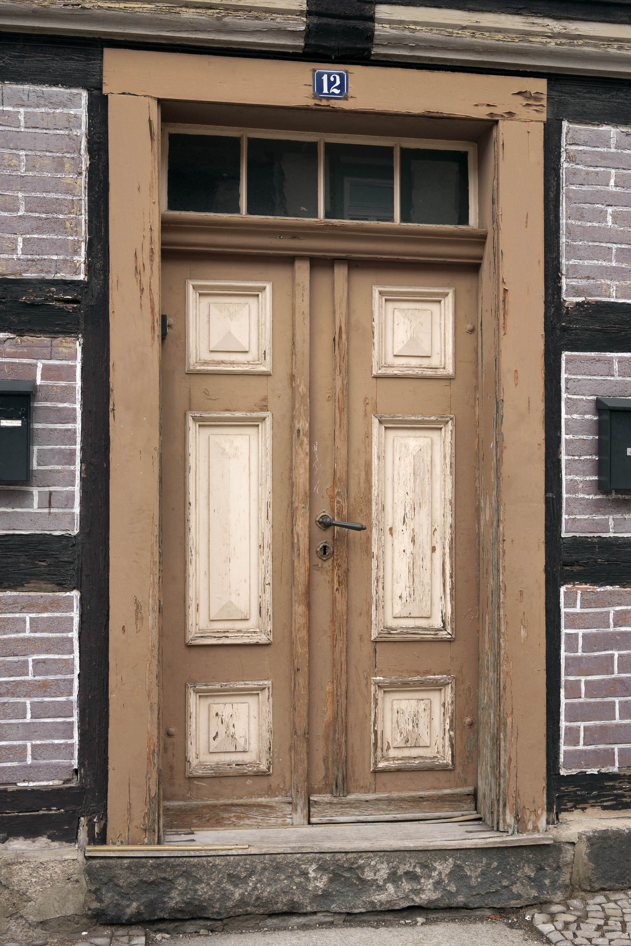Photo 12732: Decayed, panelled, light brown and light yellow double door with top window