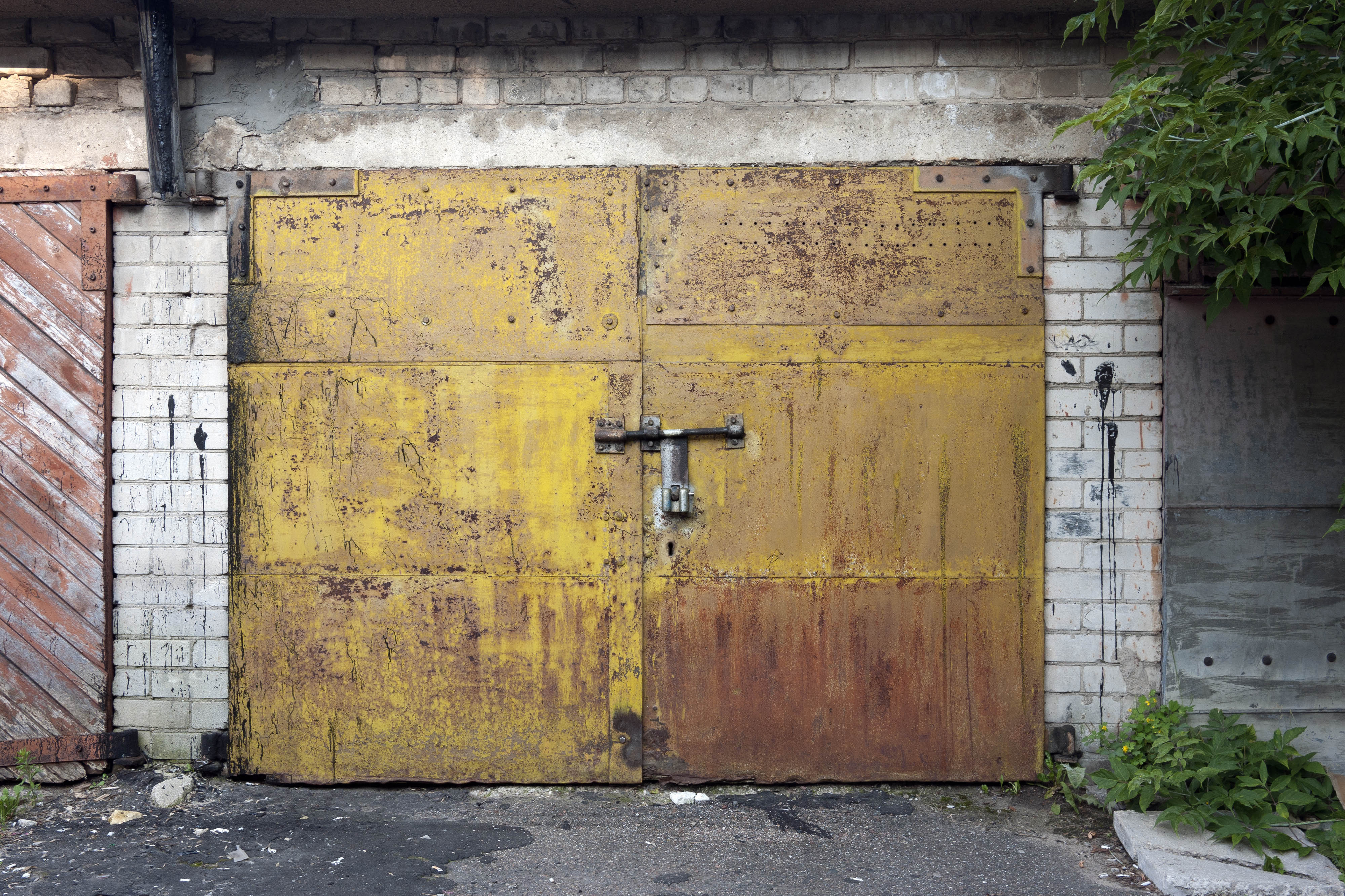 Garage door mounted in white brick wall. Padlocked.Photo from Vilnius, Lithuania.Size: 4000 x 2667 pixels.