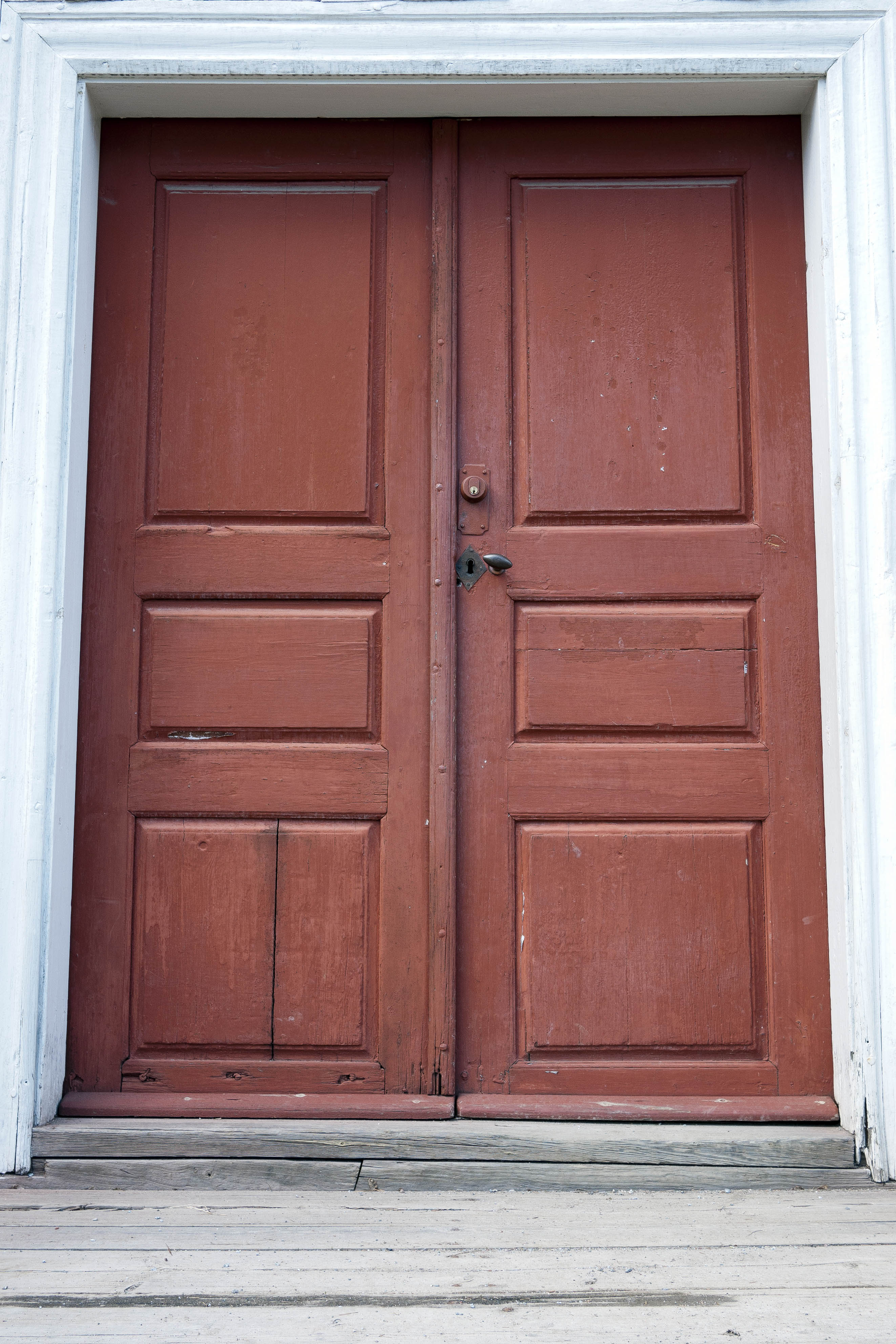 Photo 18065: Worn, panelled, red double door in a white frame
