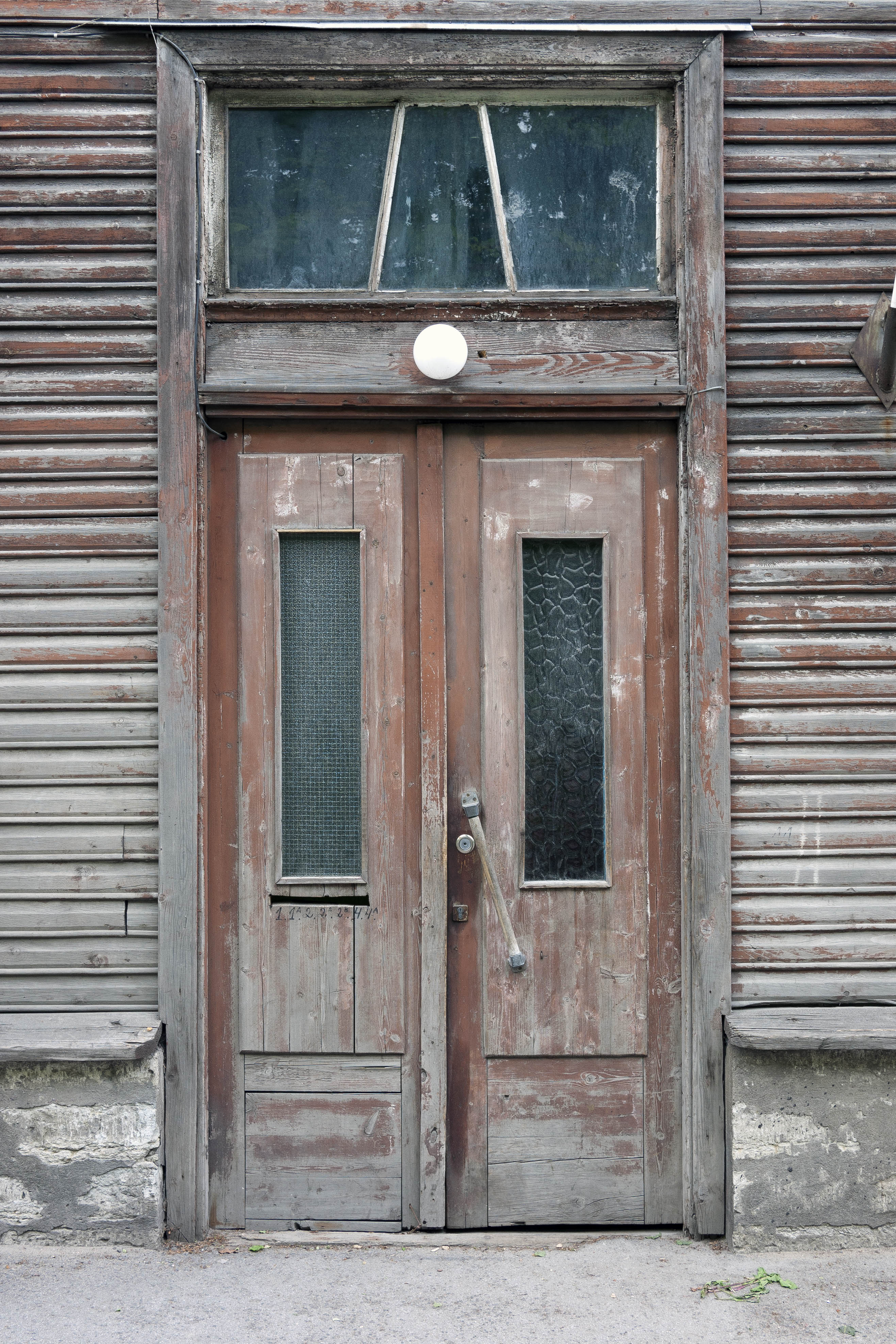 Photo 20114: Worn, panelled, unpainted and brown double door with top window