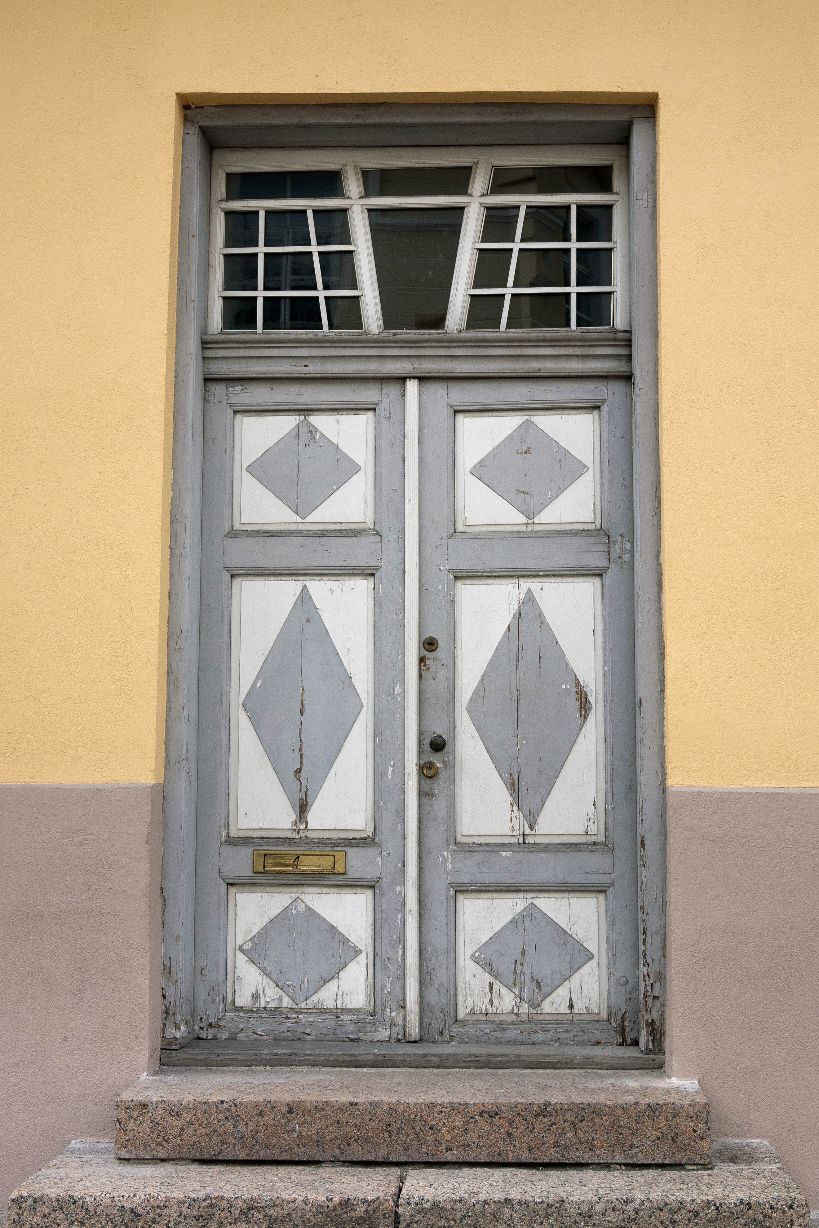 Photo 20140: Worn, panelled, grey and white double door with top window