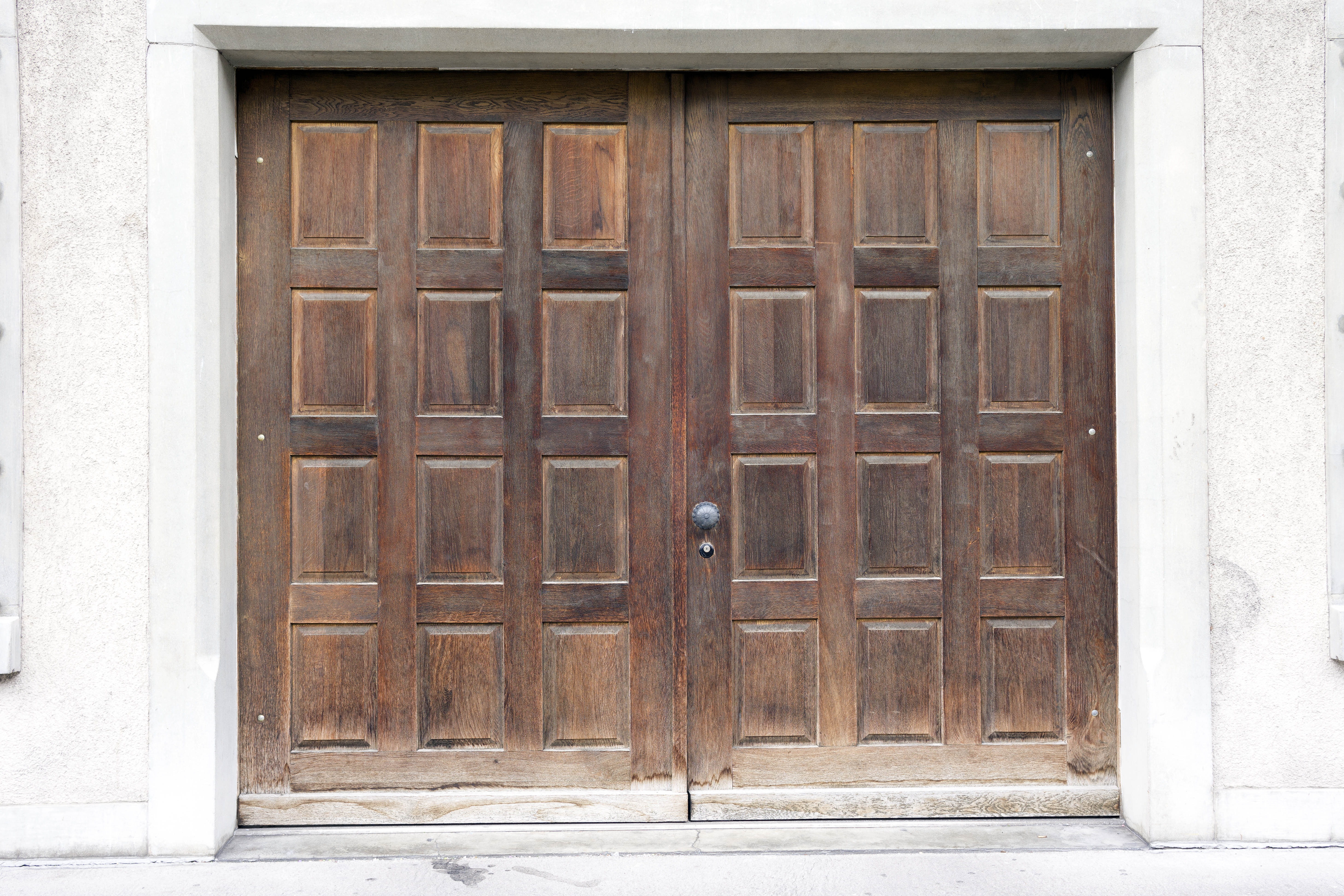 Photo 23830: Worn, panelled, oiled double door with 24 panes