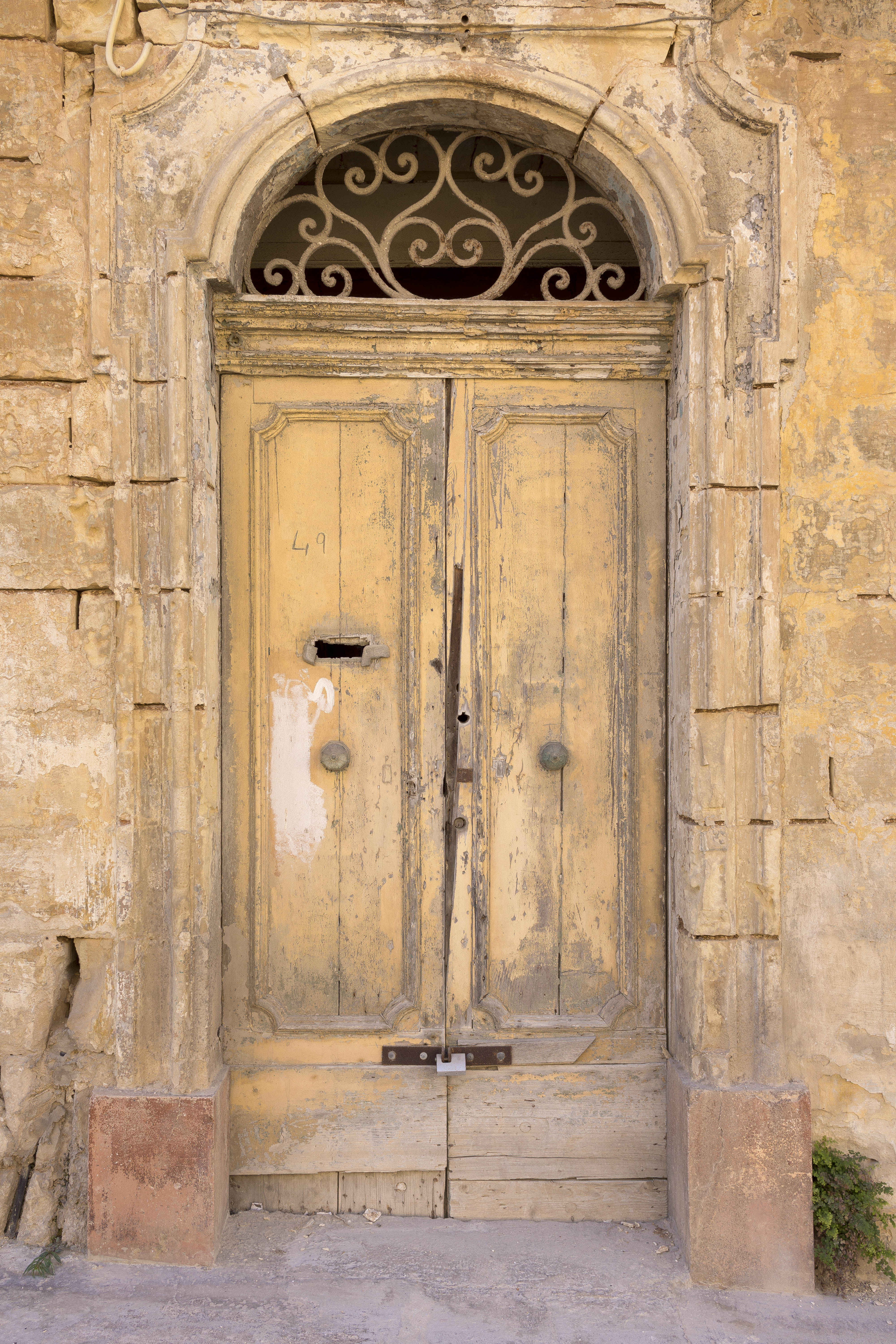 Photo 24289: Decayed, panelled, yellow and unpainted double door with latticed fan light.