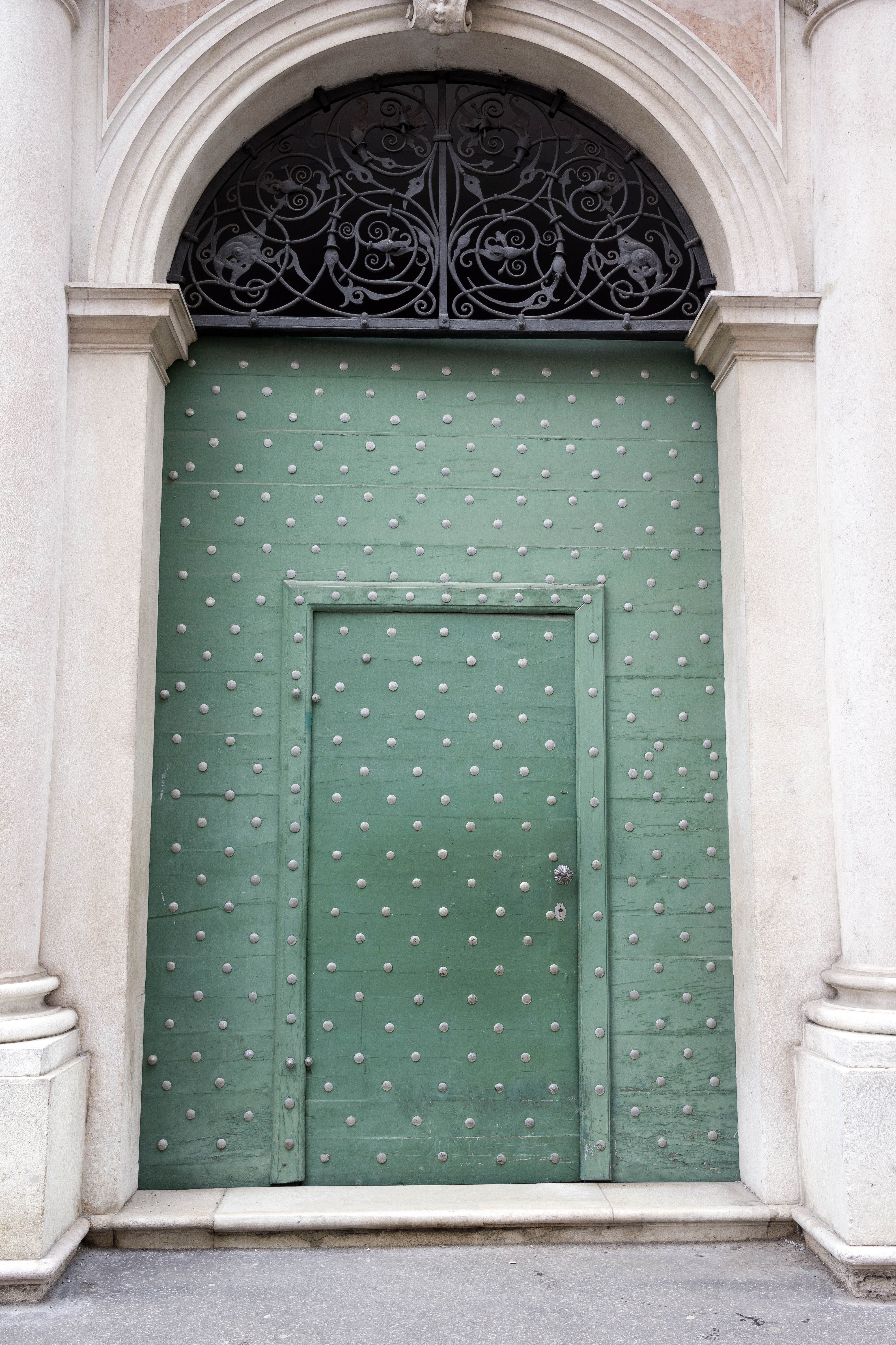 Photo 24975: Green gate of horizontal boards with many nails, minor door and latticed fan light
