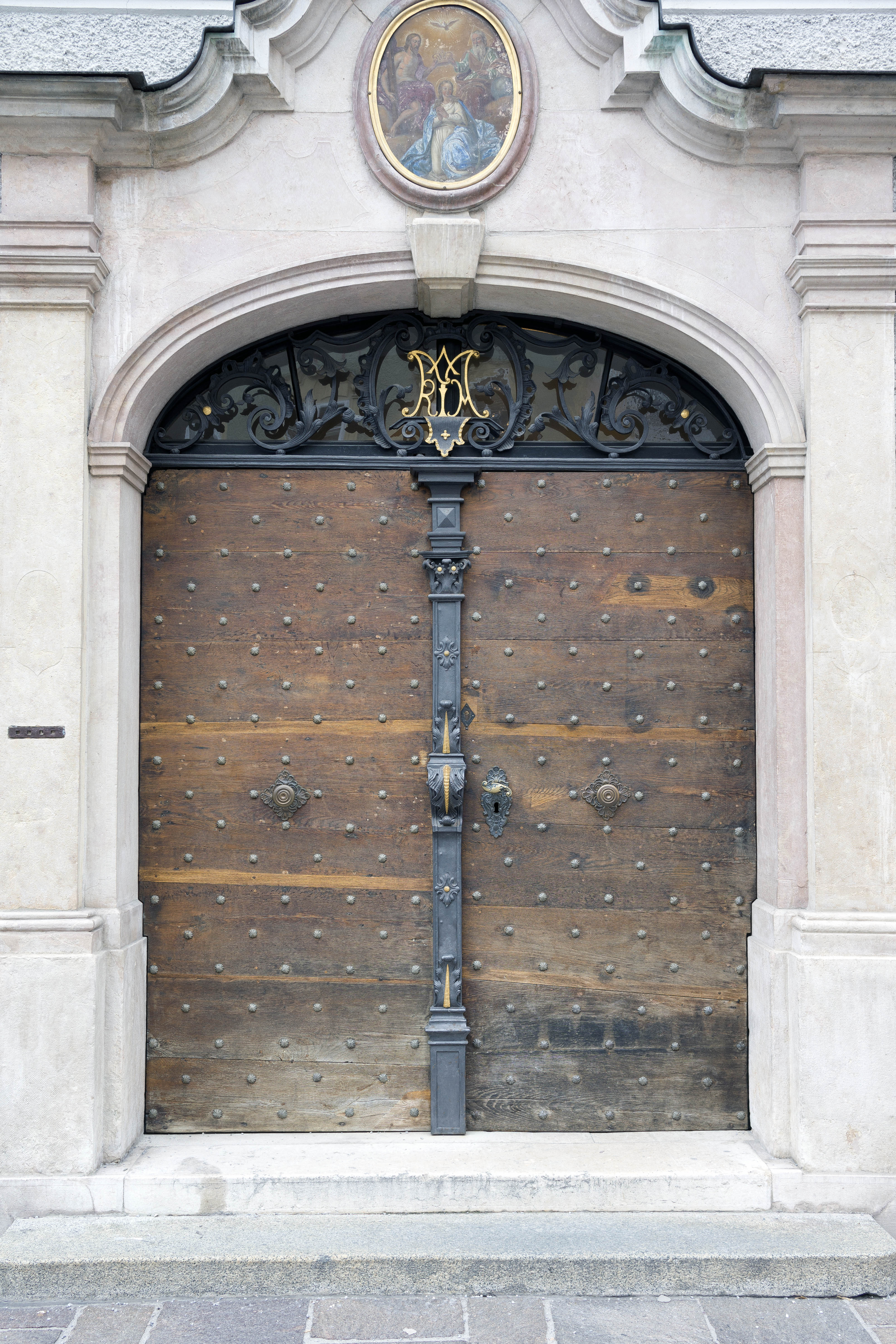 Mounted in a light grey sandstone pilastre in a sandstone wall.Photo from Salzburg, Austria.Size: 3952 x 5928 pixels.