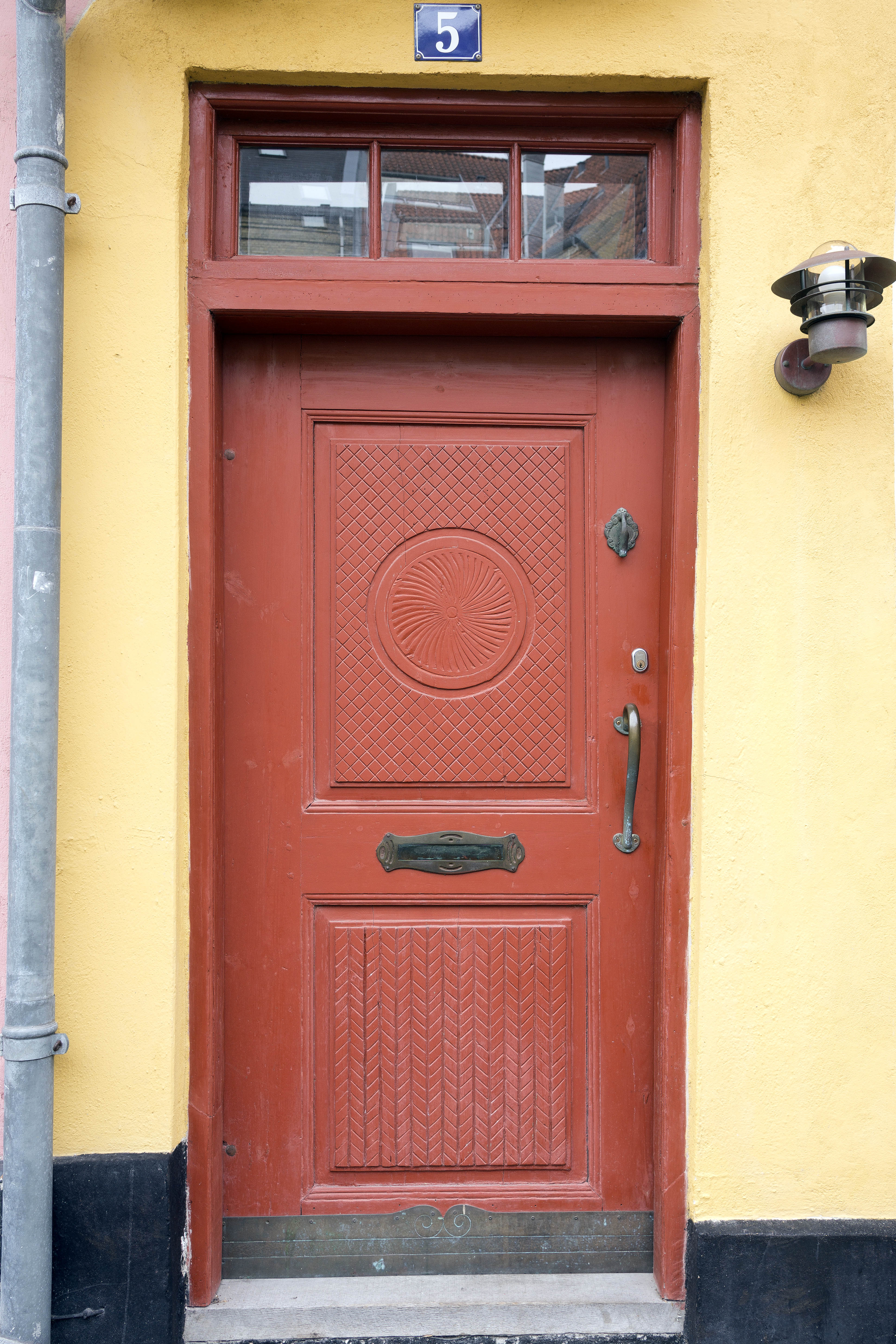 Door knocker and letter flap. Well sustained. Mounted in a yellow-washed wall.Photo from Aalborg, Denmark.Size: 3867 x 5800 pixels.
