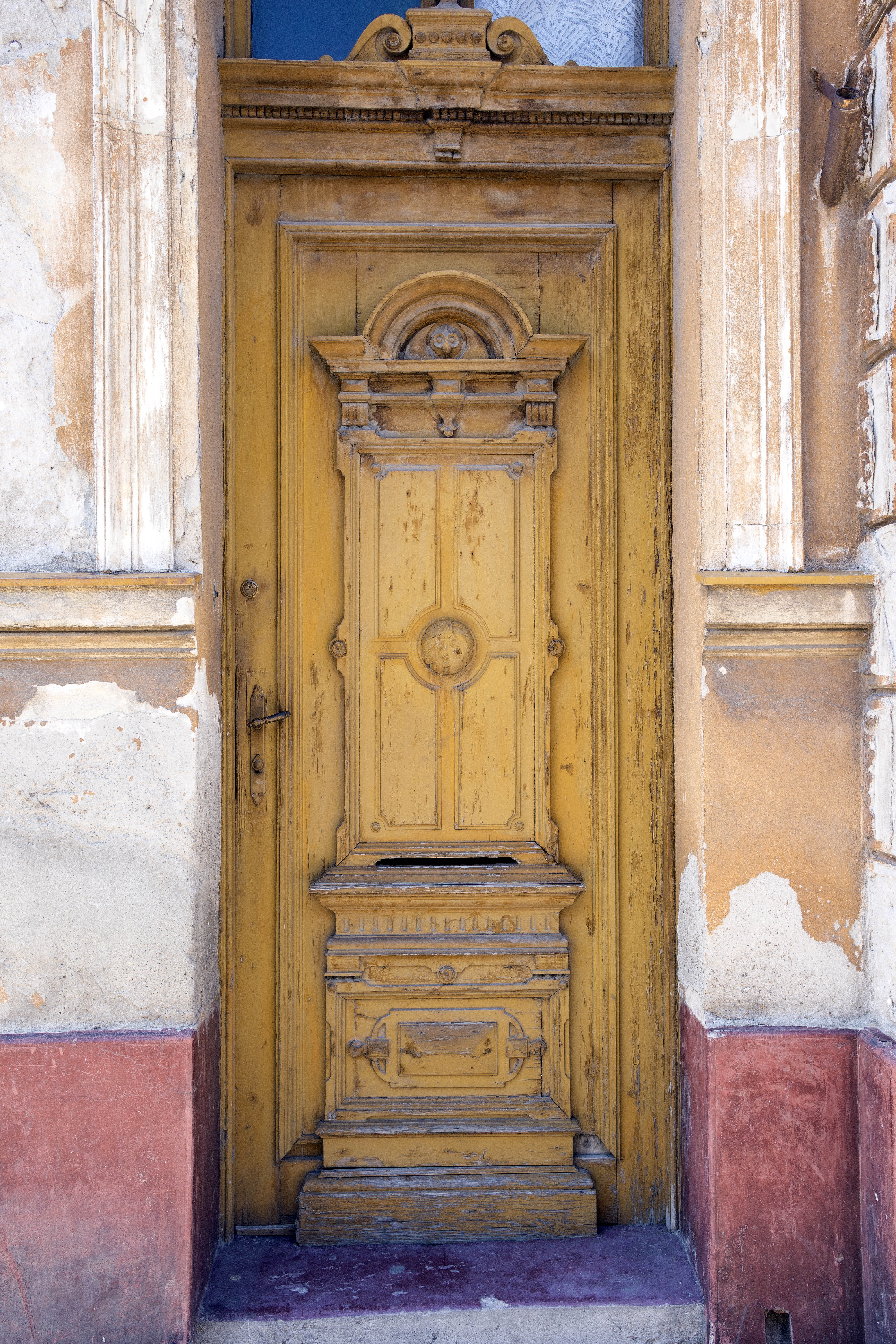 Photo 25719: Worn, panelled, carved, yellow door