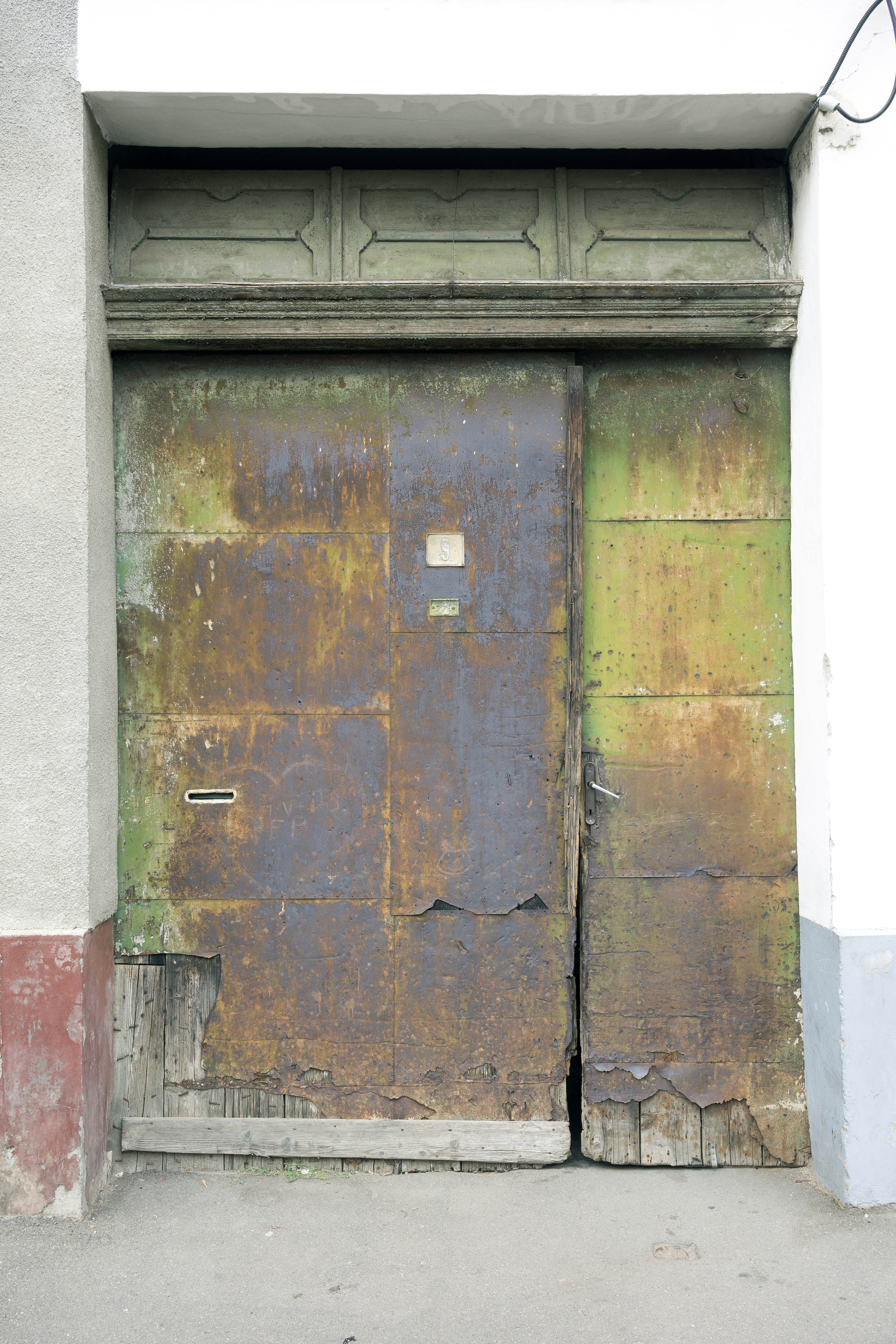 Photo 25763: Decayed gate of unpainted boards covered by yellow, light green, orange, brown and black metal plate
