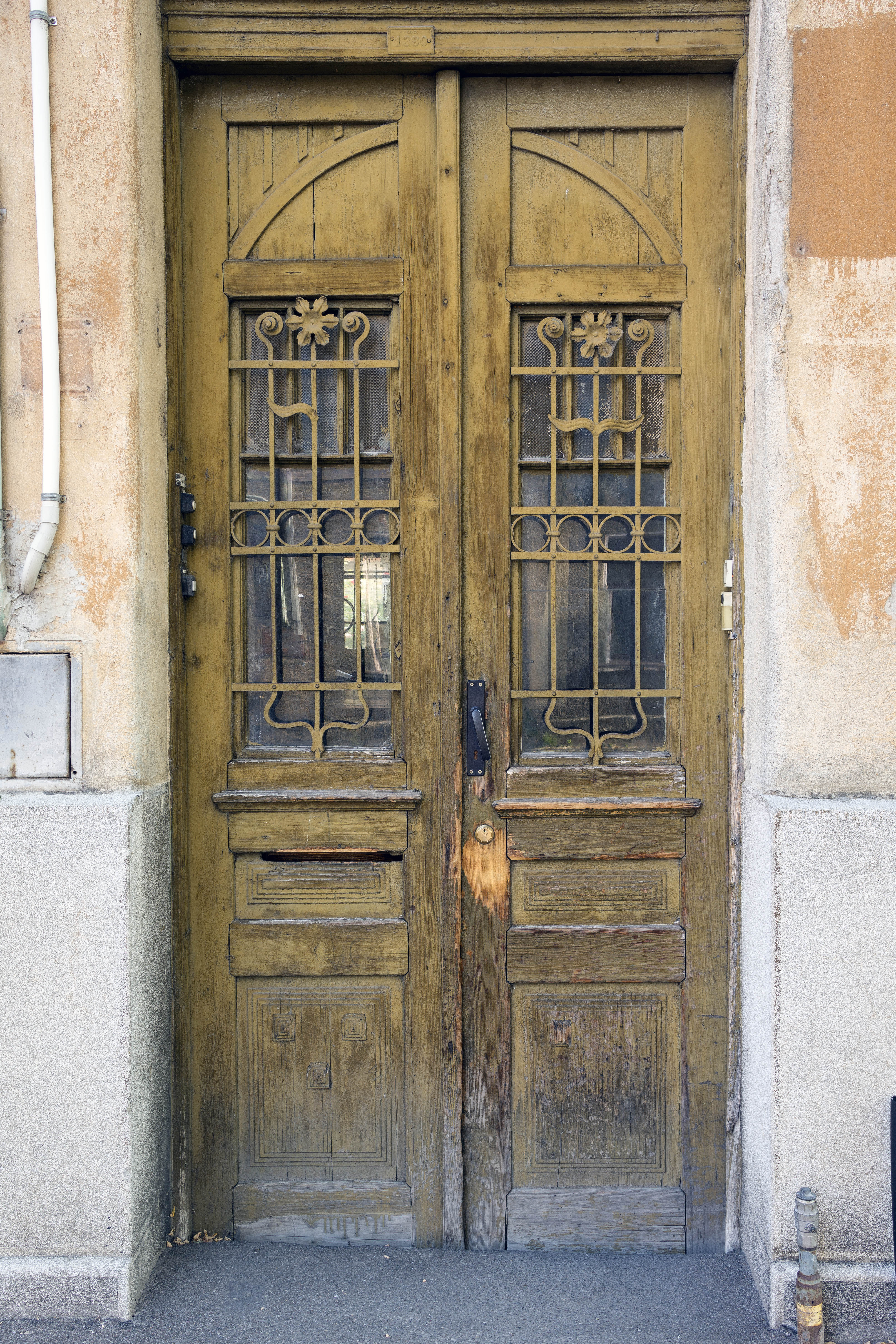 Photo 25858: Worn, narrow, panelled, carved, yellow double door with latticed door lights