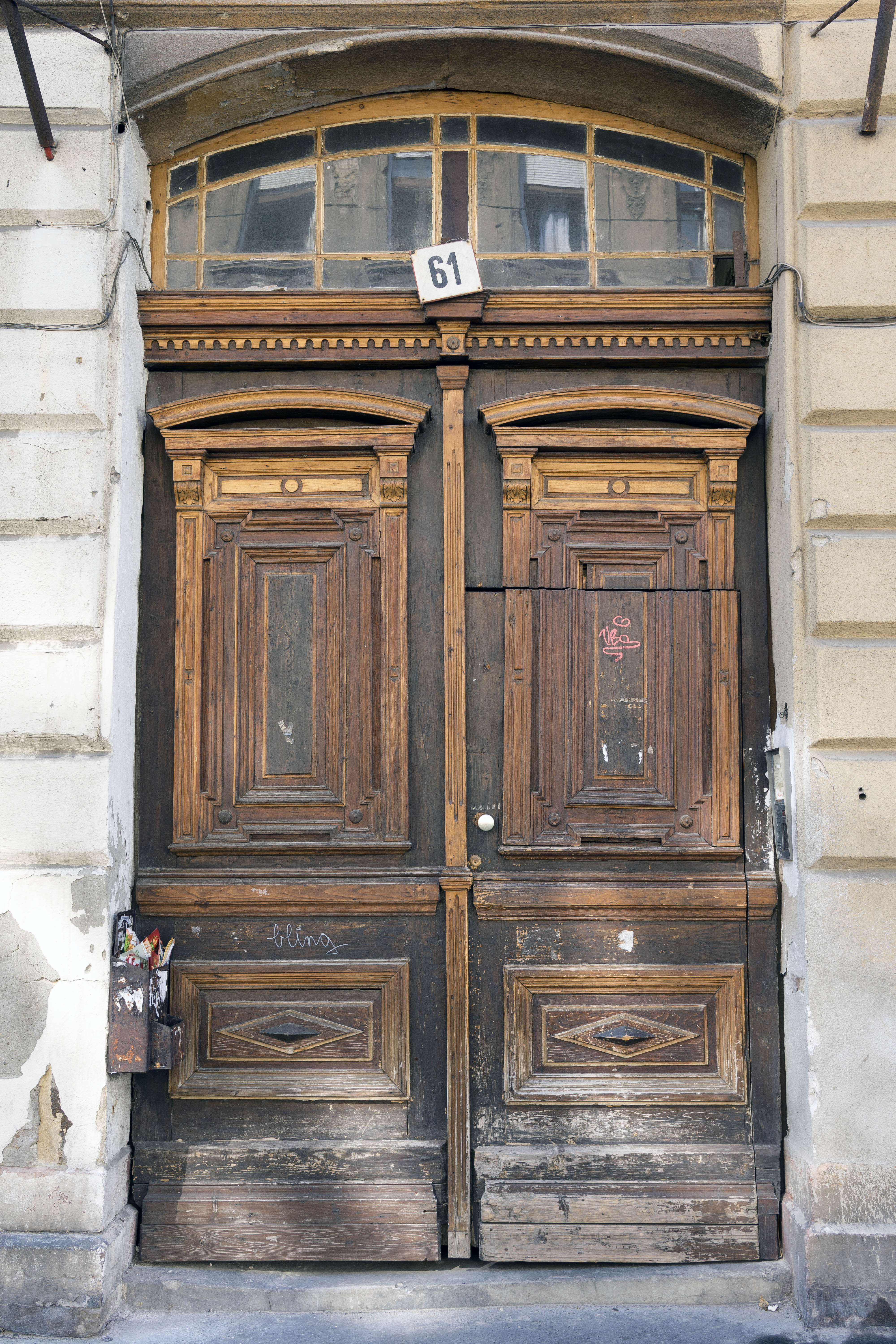 Photo 26088: Worn, panelled, brown and oiled, carved double door with fan light and minor door