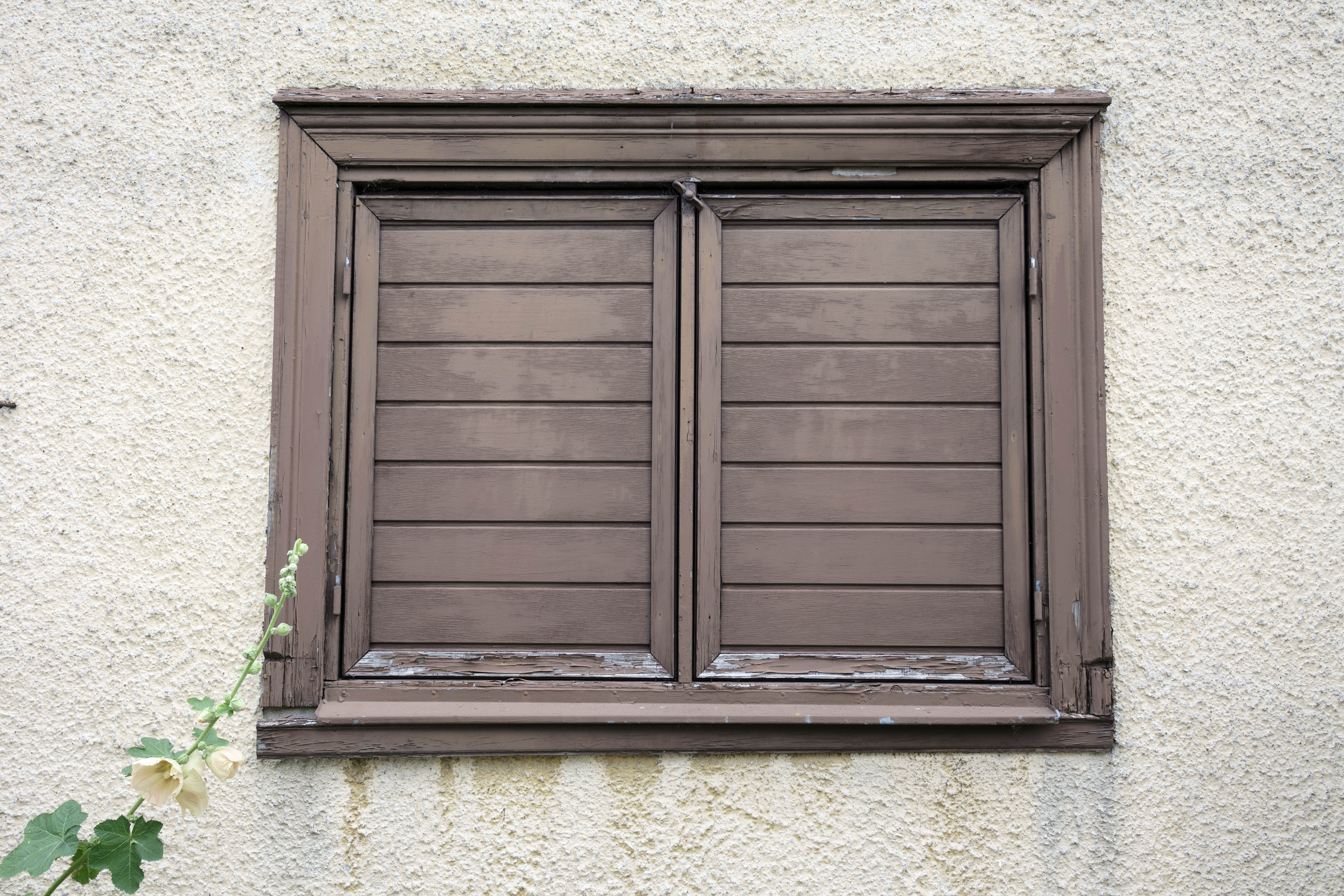 Photo 27103: Worn, brown window with double shutters
