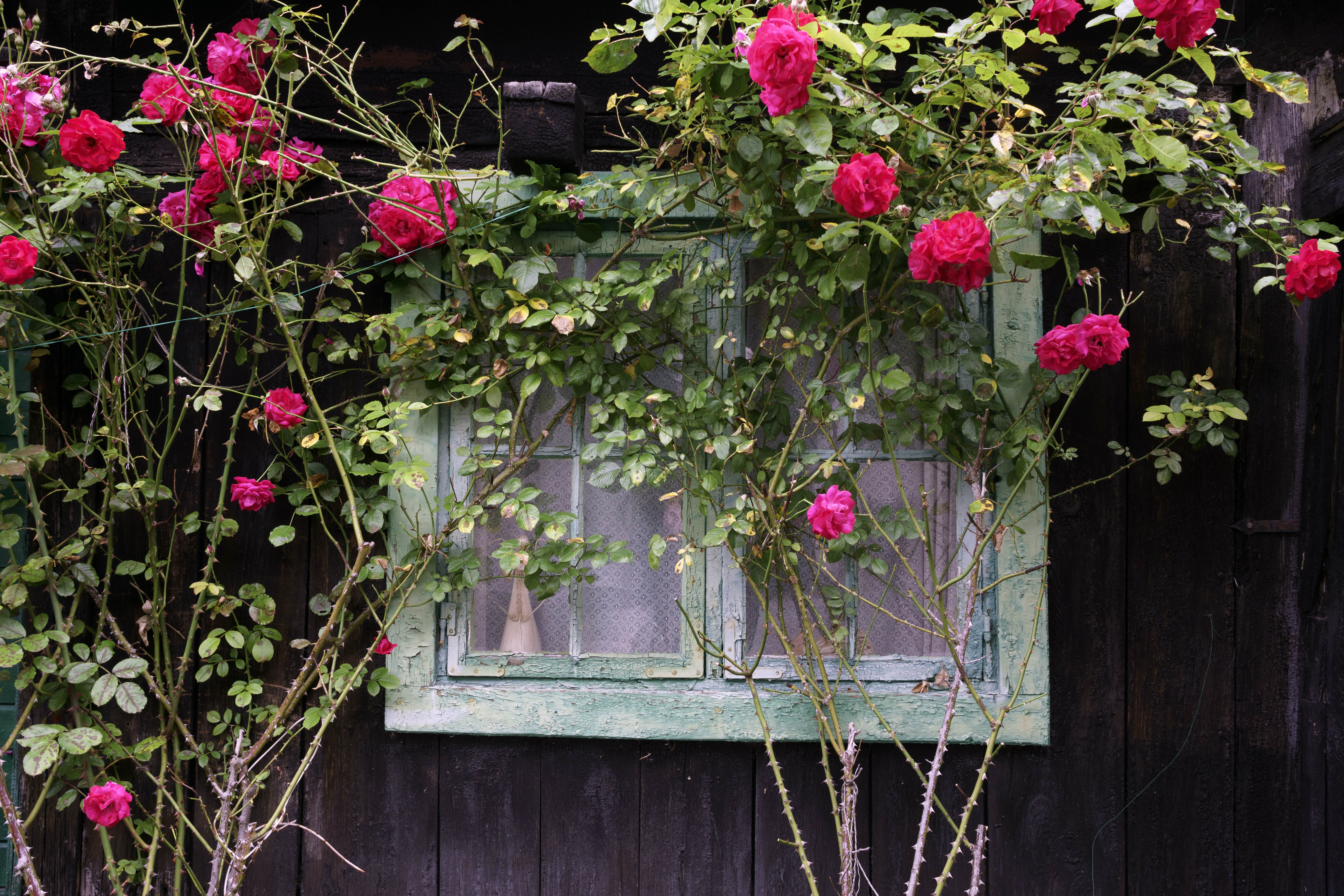 Mounted in a black wall of boards. Many roses in front.Photo from Visby, Sweden.Size: 6000 x 4000 pixels.