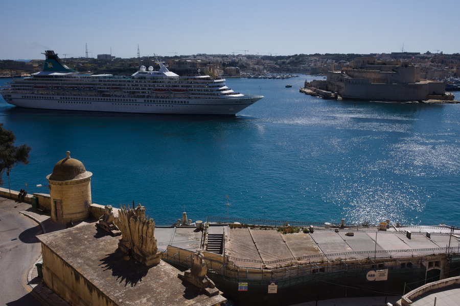 An vast cruise ship entering Valetta's Grand Harbour heading for the shipyard. Fort St. Angelo to the right and Birgu Harbour behind that.