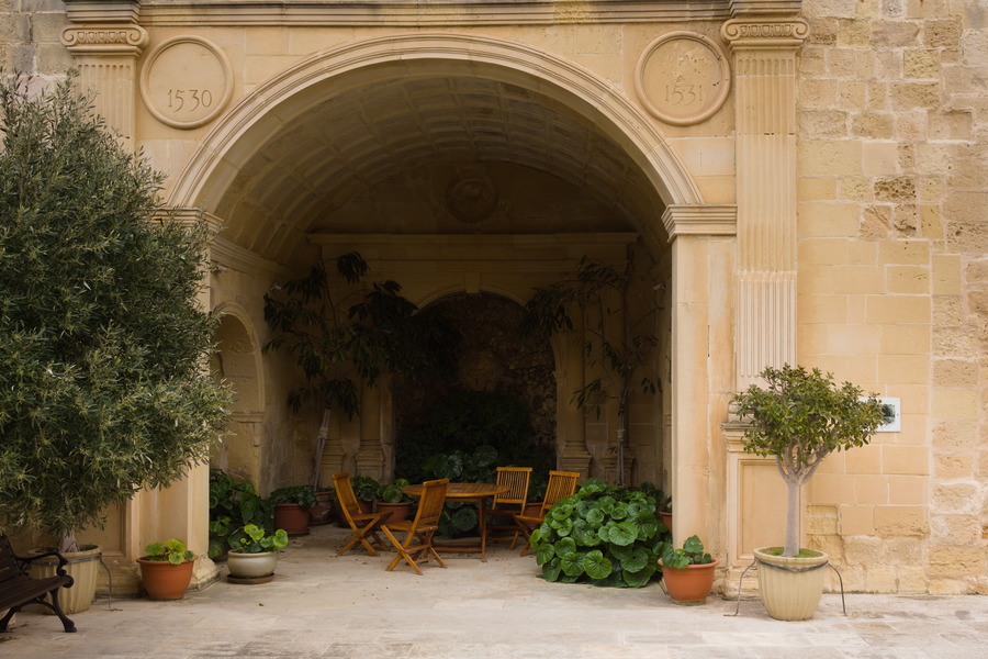 The most beautiful garden with plants and a fountain in the shadows. Officers' garden at Fort St. Angelo, the building dated 1530.