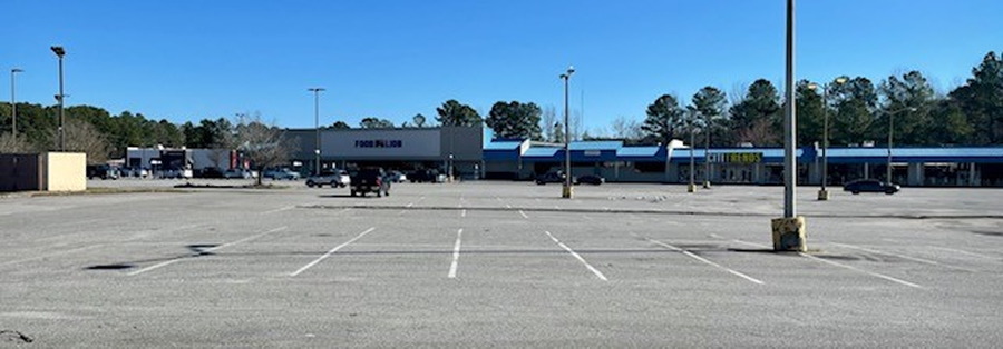 The Food Lion supermarket by the bypass road in Plymouth. All customers are expected to drive. There are no sidewalks along the bypass road.