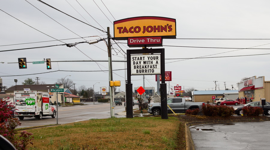 Broad Street, Elisabethton, Tennessee, a bypass road with typical chain stores: Taco John, Family Dollar, Wendy's, McDonalds, Advance Auto Parts, Citizens Bank, Regions Bank, Walgreens, Kentucky Fried Chicken, Hardee's, Save a Lot (supermarket), Papa Johns Pizza, Title Max, Dollar General.