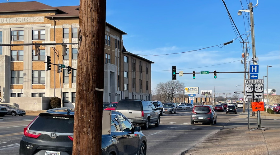 The only way that American towns will have business life in the center of the town is by letting the highways run right through downtown. Here is the intersection between Highway 27 and Highway 64 by Pope County Courthouse, Russellville, Arkansas.