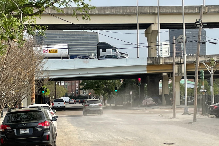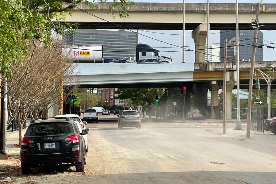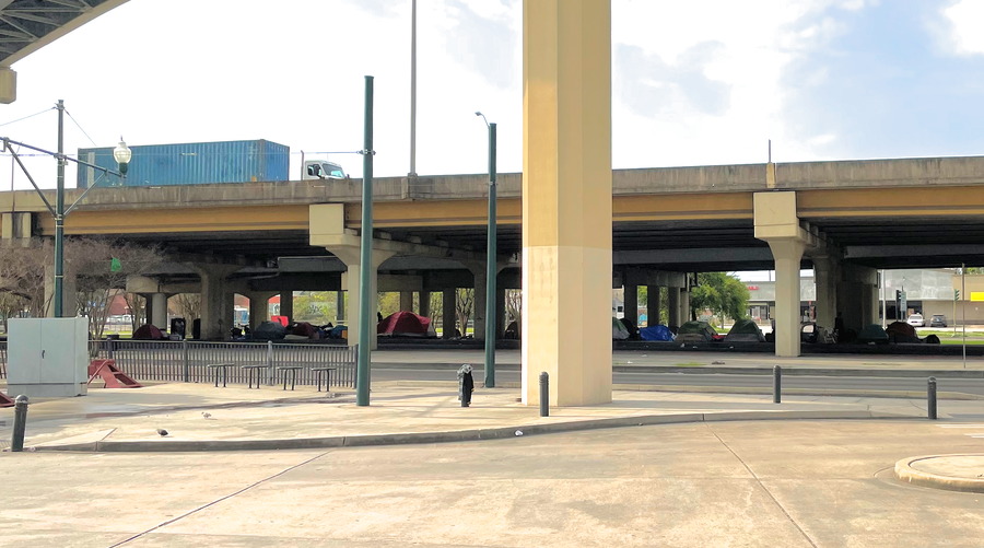 New Orleans: If you walk between French Quarter and Garden District you must pass below Interstate 90. Here the homeless will shout at you and ask for money. There is a tent visible right under the red traffic light.