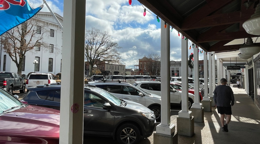 Boardwalk in the central Courthouse Square, Oxford, Mississippi, a city where the shops have survived at the city center. To the left is Lafayette County Courthouse.