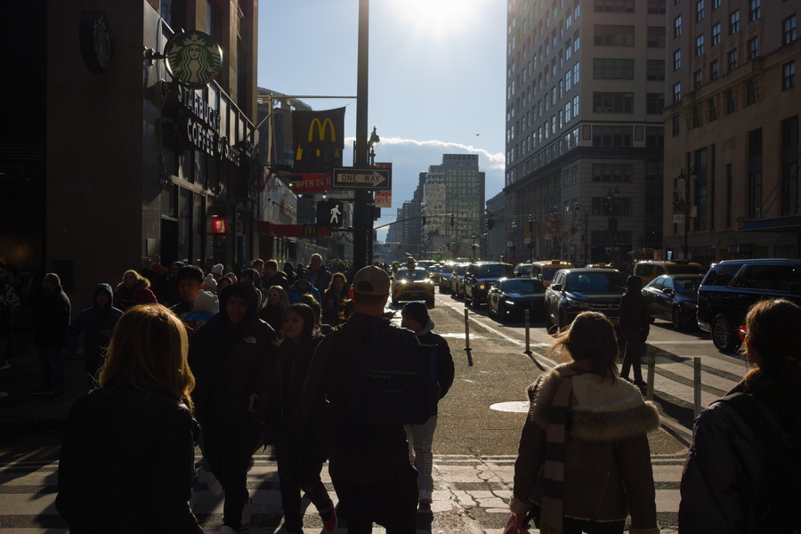 The general pattern with wide streets and few pedestrians is broken in the old harbour towns New York, Charleston, Savannah and New Orleans. These towns were founded by Dutch, British and French colonial authorities. Here are pedestrians in Manhattan, New York. The green light for pedestrians is not green, but white.