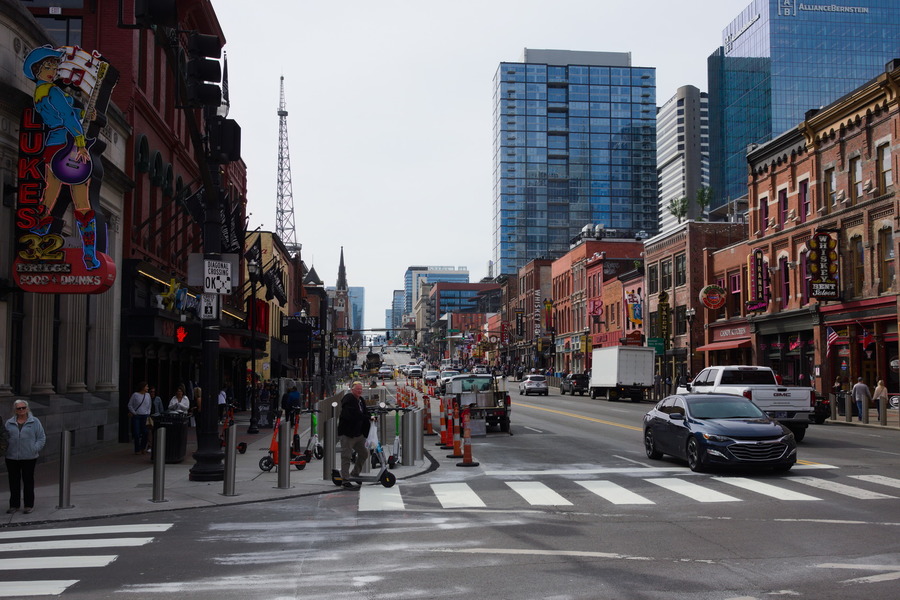 Downtown Nashville, Tennessee, is another exception, where people get around on foot, often entire families in a group. The red light for pedestrians is red, actually.