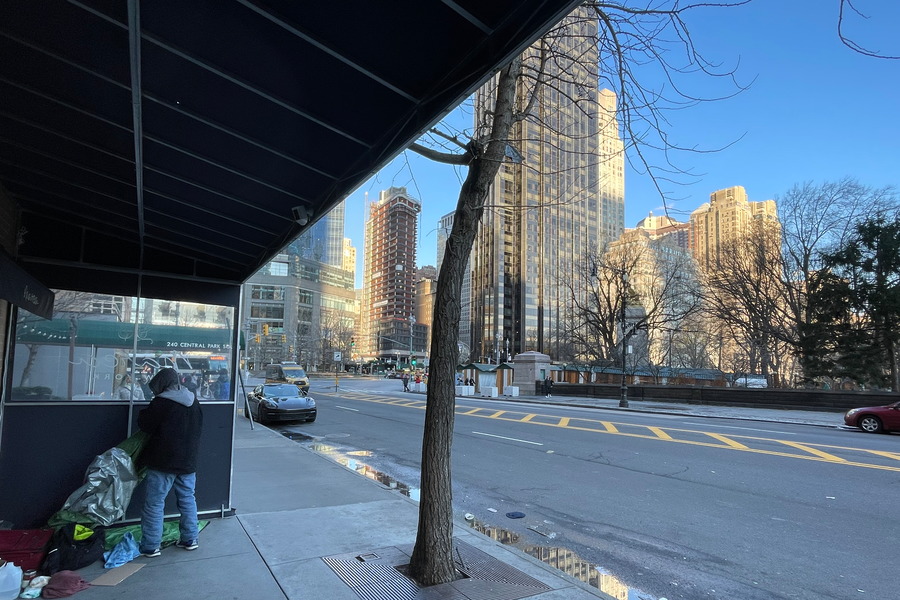 A man is packing up after sleeping on the streets in New York.