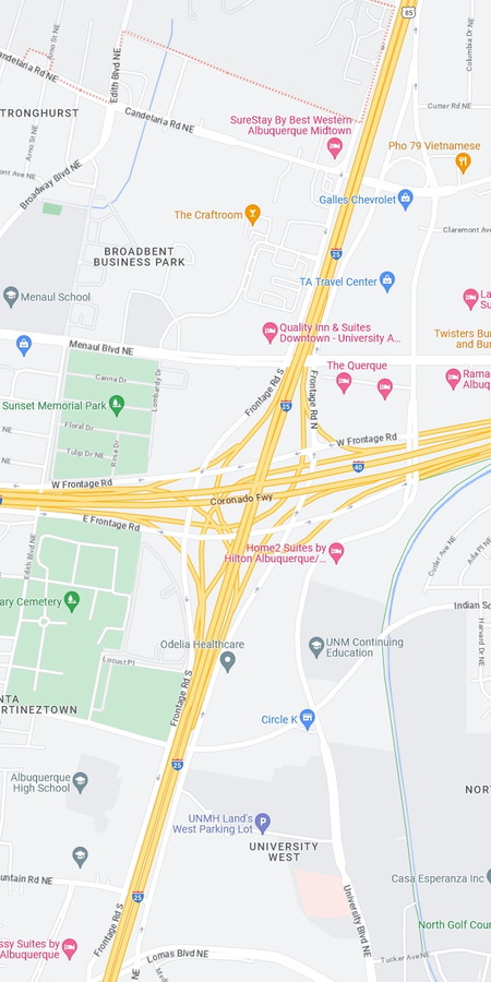 Interstates 25 and 40 intersects in the middle of Albuquerque, Texas. Google Maps.