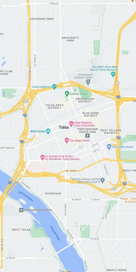 Interstates 64, 244 and 444 surrounds downtown in Tulsa, Oklahoma. Google Maps.