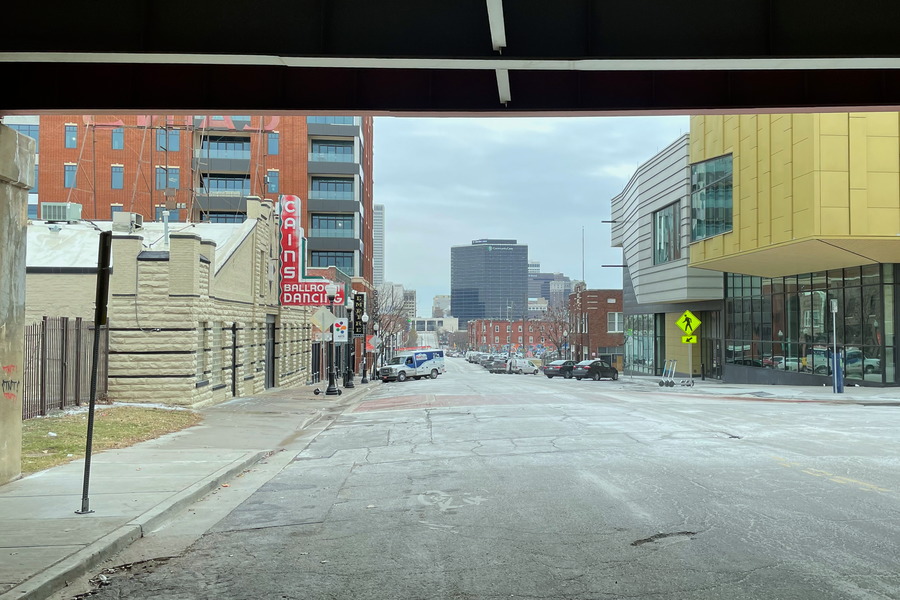 Downtown Tulsa seen from Interstate 244. The homeless live under the bridges - also under this bridge.