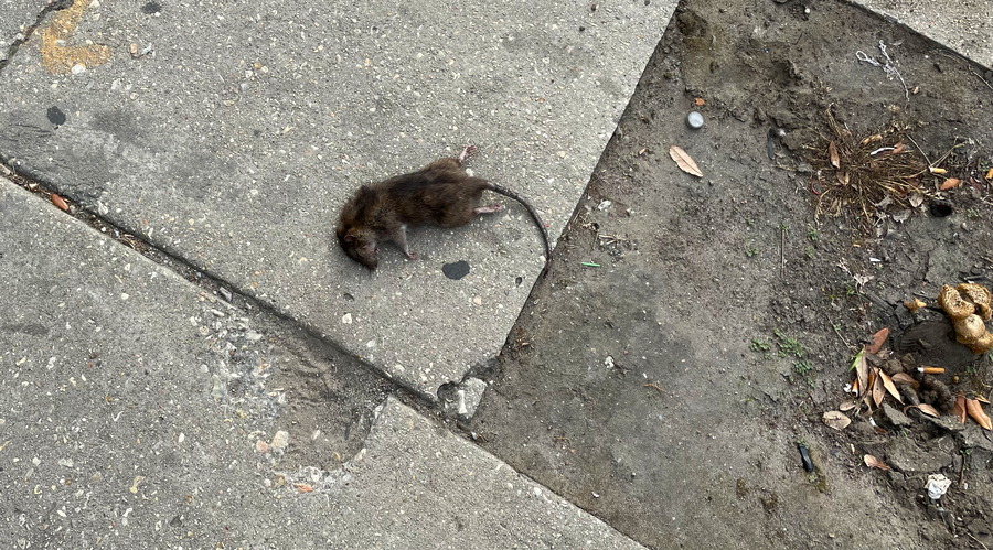 Livestock of the homeless: A dead rat near the tents under Interstate 90 in New Orleans.